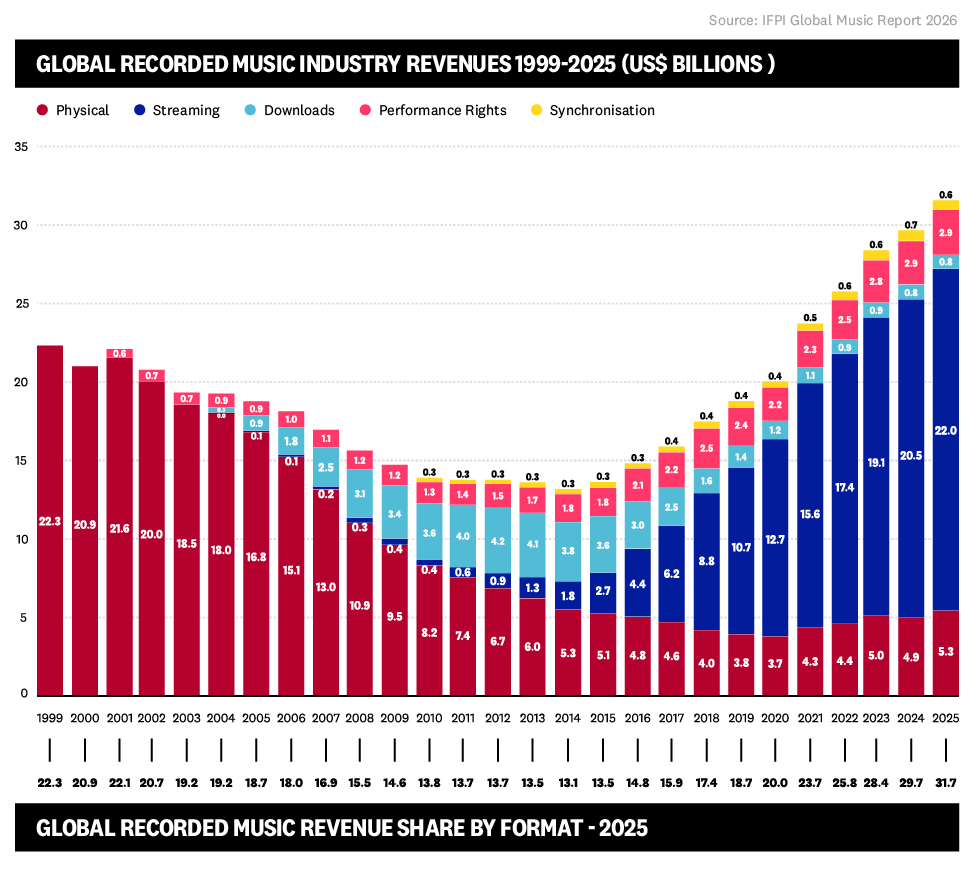 Streaming stays the engine of trade progress. Paid subscription streaming income rose 8.8% in 2025, serving to push complete streaming income previous $22 billion for the primary time. Streaming now accounts for almost 70% of complete recorded music revenues, underscoring as we speak’s streaming-first actuality.